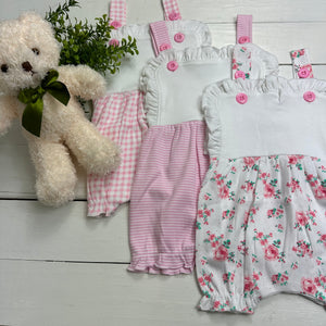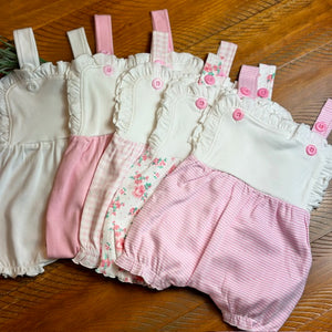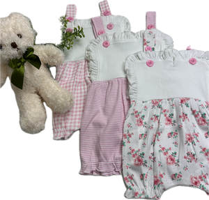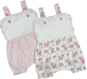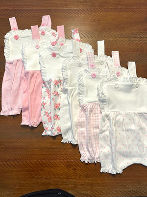 Comes in several styles Floral with White Bib, Pink & White Check with White bib and Pink & White Stripe with White Bib, White Polka Dot White Bib, Solid White and Solid pink with White bib. perfect for a monogram or name. They come in 3M - 2T except the Pink and White Stripe they are currently only available in 3M & 6M.