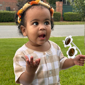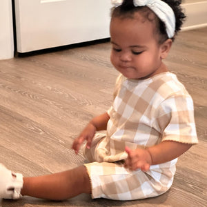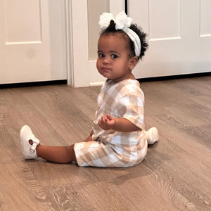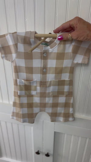 Get ready to rock this stylish one-piece romper with big and bold White and Light brown Check! It features two front pockets and a comfy short sleeve design, made with 100% cotton for a cozy fit. But that's not all - the eyelet trim on the sleeves and legs adds a touch of flair and the great fall color makes it perfect for the season. Don't miss out on this must-have addition to your wardrobe!