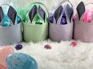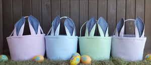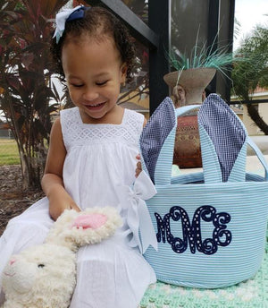 Cute little Easter basket featuring floppy ears. Baskets have a seersucker shell with navy gingham lining. These cute little buckets are approx 9.25" in diameter and 7.25" deep. Overall height is approx 13" high.