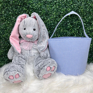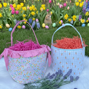 Get ready for spring with our Plaid Gingham Easter Baskets or our very Special Bunny Garden and Carrot Print! WE JUST ADDED QUILTED BASKETS, they come in Pink and Baby Blue.