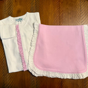 Say goodbye to our beloved sherbet pink—a dreamy blend of soft pink kissed with purple undertones—with this exclusive clearance bundle! This ruffled girls footie is being discontinued in this gorgeous shade, so snag it while you can. We've bundled it with a coordinating ruffled burp cloth and with a matching beanie hat at a special discounted price. Pick your perfect pairing: sherbet pink burp cloth with white ruffles or white burp cloth with sherbet pink ruffles, and with a matching beanie hat if you would like all 3 as a bundle! Both match the footie's playful ruffle detail. Limited stock available!