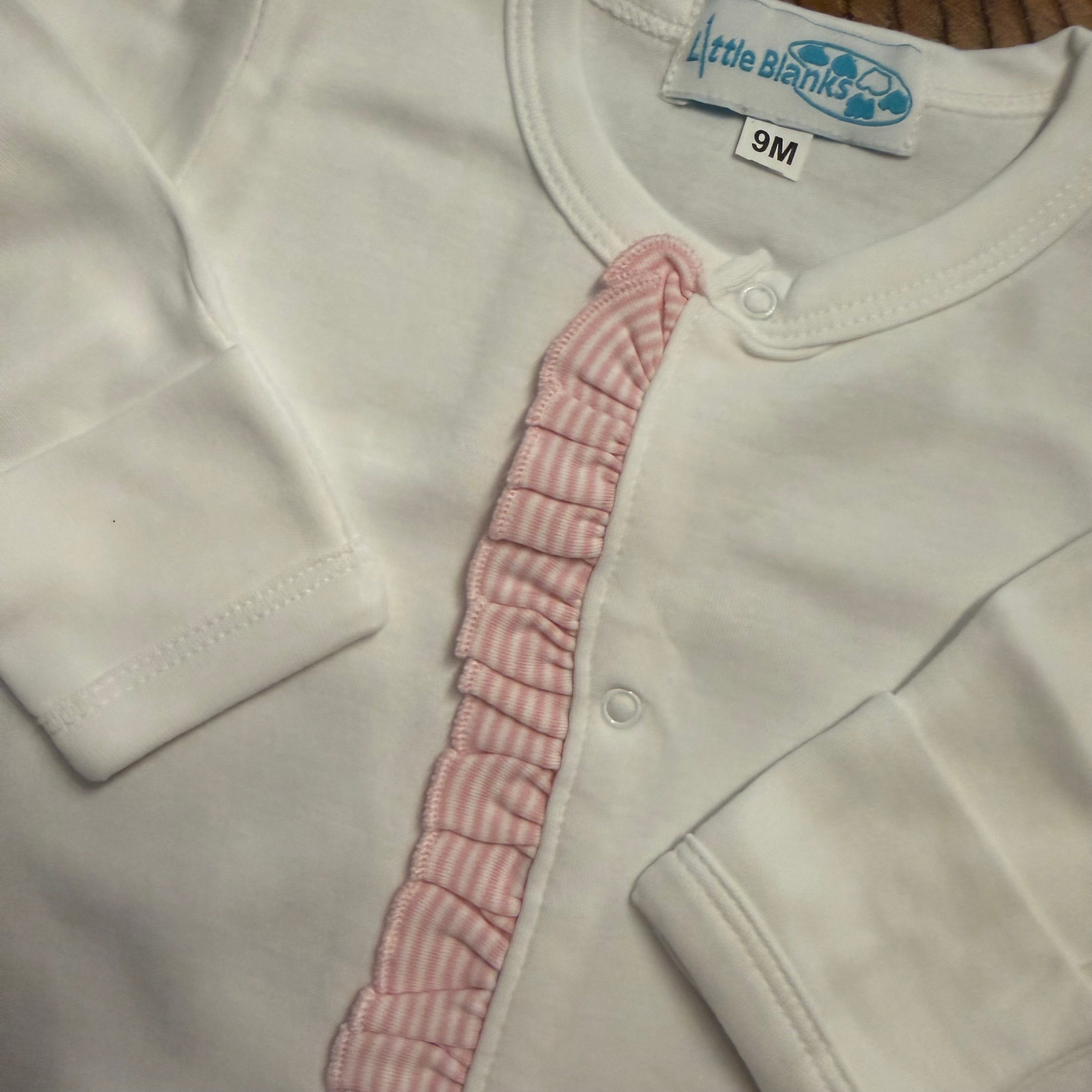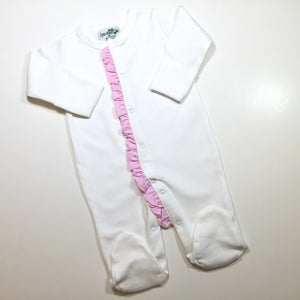 We also have a small quantity (only 6 available in size 9M ) of this footie in a classic white with pink & white stripe ruffle. This style is being offered at a discounted price as well, however it is sold as the footie only and is not available as part of the burp cloth or beanie bundle.