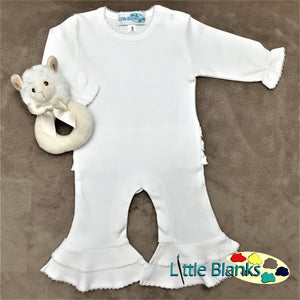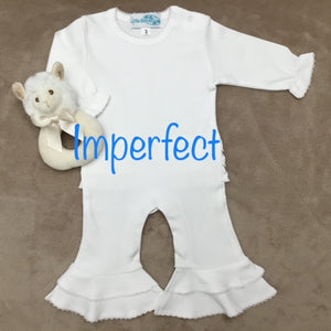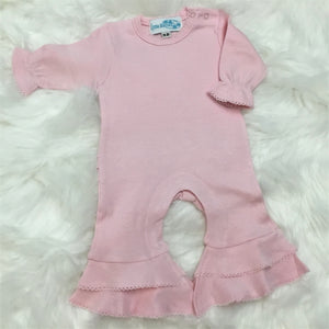 White Baby Girl Romper with ruffle accent on sleeve.  Pink Baby Girl Romper with pink and white striped pattern.