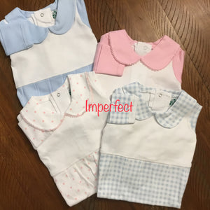 These are blemished. These products are considered imperfect due to a small stain or two noticeable through the packaging. The flaws can possibly be covered by embroidery or applique. They are also great if you want to show off your creativity for advertisement purposes. Unknown what the stain is or whether it can be removed by washing or spot treating.