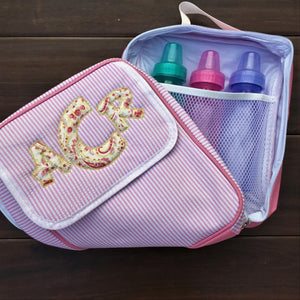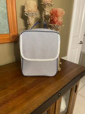 Seersucker insulated lunch box tote - There is two zippers for an easy opening, along with a handle at the top for easy carrying. Pocket in the front flips up to make embroidery easy! The Front pocket closes with velcro. One mesh pocket on the inside.